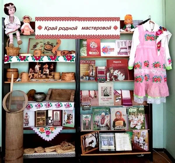 Мастерство марийского народа отражается в художественных промыслах: вышивке, ткачестве, лозоплетении, изготовлении бересты, соломы, глины. Художественные промыслы марийцев бережно сохранились мастерами до наших дней. Промыслы играют важную роль в развитии современного общества, являются национальным богатством. Они вносят самобытную красоту, помогают современным людям понять эстетику прошлых поколений, ощутить связь со своими корнями, с исторической памятью народа. Марийские мастера изготавливали из различных материалов посуду и утварь, орудия труда, одежду, украшения, обувь (лапти), детские игрушки и музыкальные инструменты. На нашей выставке представлены экспонаты из «Этнографического уголка марийской избы» МБУДО «ДШИ №4», из домашнего фонда сотрудников библиотеки, читателей: корзина из лозы, туесок из бересты, ковш-утка для хлеба, деревянная бочка, деревянные ложки, корыто для сечки капусты, сито, маслобойка, чугунок, шкатулка, ступа, тапки из лыка и лапти. Литература по краеведению раскрывает суть художественных промыслов. Книги из выставки расскажут об истории и культуре нашей республики. Предметы быта, сохранённые до наших времён, дают возможность перенестись в прошлое, окунуться в старину, узнать больше о жизни наших предков.