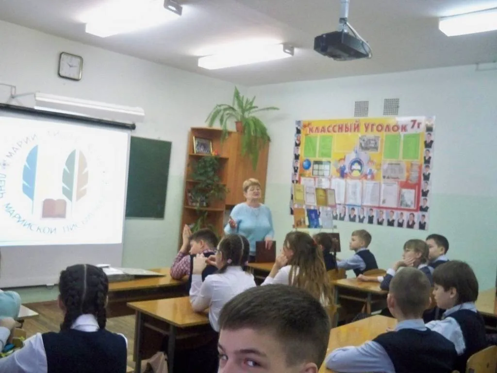 Знакомству с историей возникновения марийской письменности очень помогли слайды презентации, на которых были представлены и первые книги, и словари марийского языка, и марийские календари. Читали стихи на марийском и на русском языке. В конце мероприятия провели викторину, в которой дети принимали активное участие.