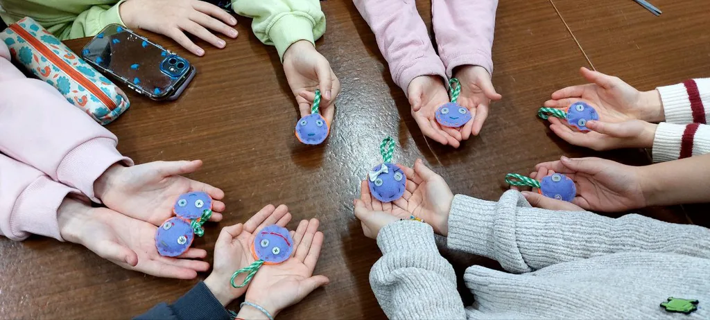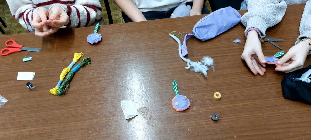 Сегодня наше занятие было посвящено закреплению навыков ручного шитья. Девочки продолжили работу с фетром, отметили его практичность – края его при обрезке не требуют обработки, так как не осыпаются – идеальный материал для ручного шитья. На предыдущем занятии мы оформляли «лицо» подвеса: пришивали глазки-пуговицы, вышивали рот, брови, а сегодня соединяли две части изделия швом «вперед иголка». И петельку для подвеса. Для этого мы использовали яркие нитки для вышивания разных оттенков, особенное внимание уделив технике закрепления рабочей нити в начале и в конце работы, ведь аккуратность работы важна. Но самое главное достижение сегодняшнего занятия – создание чудесной игрушки-подвеса с озорным выражением «лица», которая теперь станет отличным украшением для автора-владельца и предметом гордости за свои умения.