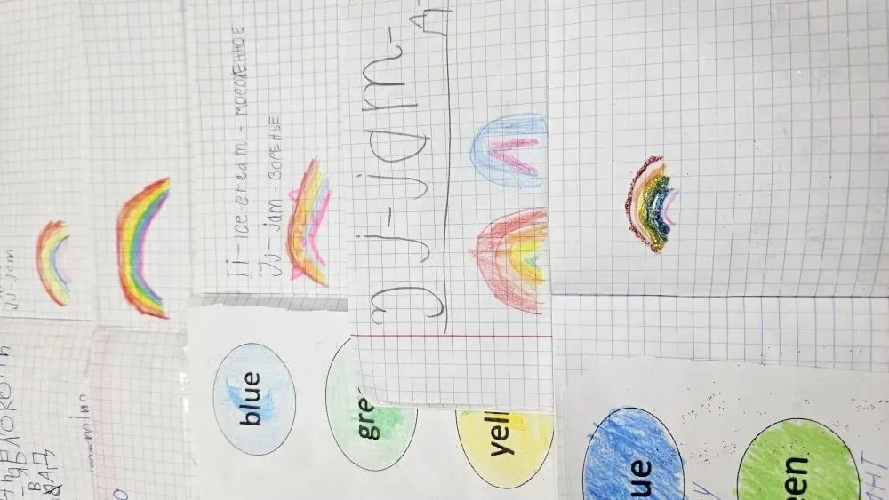 27 ноября с участниками лингвистического кружка «Веселые друзья» прошел обобщающий урок «Повторим, закрепим». Каждое занятие мы начинаем с повторения английских букв и звуков. Скоро будем знать весь английский алфавит. Немаловажной частью в нашем обучении стало проговаривание различных рифмовок, так особенно полюбилась рифмовка «Good morning! – Доброе утро!». Устроили небольшое соревнование – кто лучше ее проговорит. Для закрепления и обобщения темы «Цвет» с участниками была проведена игра «Снежный ком», а потом им нужно было, используя цветные карандаши и знания английских цветов, нарисовать радугу. Получились у всех очень красивые, яркие радуги. Также поиграли в игру «Назови цвет»: один участник показывал предмет (например - книга), а второй называл какого он цвета (красная – red). Мы, конечно, изучили не все цвета, но основные, которые пригодятся нам в дальнейшей работе. Завершился обобщающий урок подведением итогов и постановкой целей на следующее занятие. Участники кружка в конце урока говорят друг другу «Good bye!»