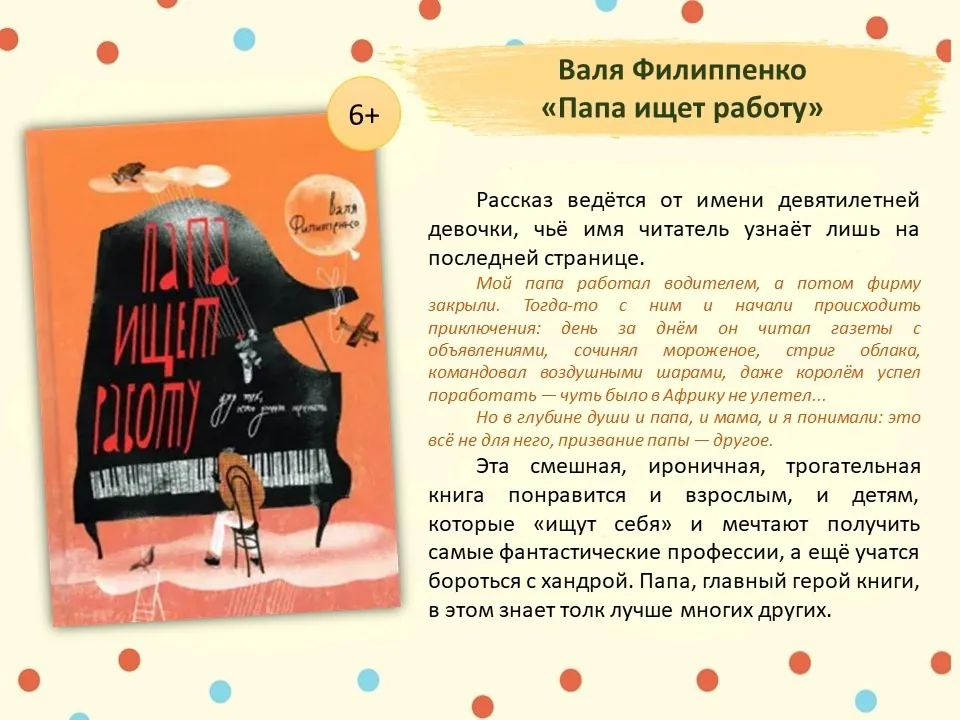 В детской литературе папы тоже все разные: строгие и мягкие, добрые и злые, веселые и грустные. Например, папа из книги Вали Филиппенко «Папа ищет работу» научит бороться с хандрой, так как он в этом знает толк лучше многих других. В книге описывается история семьи, где папа меняет одну профессию за другой в поисках своего призвания, постепенно обрастает фантастическими деталями и гротескными иносказаниями, а под конец радует трогательным счастливым финалом.