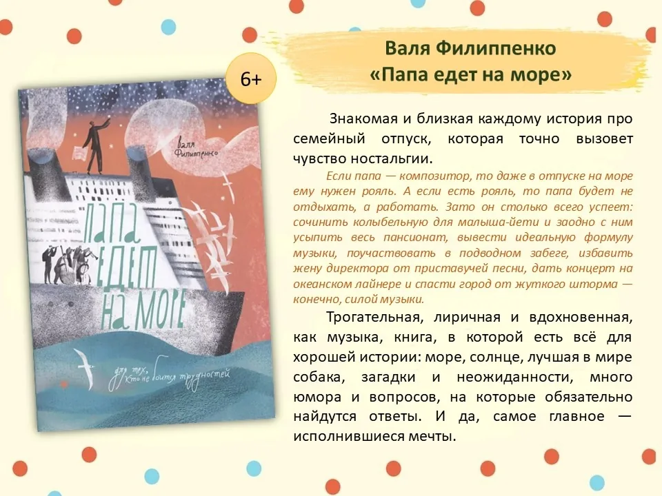А прекрасный и неугомонный папа из книги «Папа едет на море» поможет отвлечься от плохой погоды и пасмурных мыслей. Читая эту семейную историю, можно перенестись на самый невероятный курорт, где светит солнце, плещет морская вода и на пароходе играет музыка.