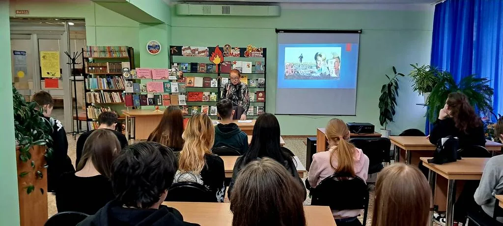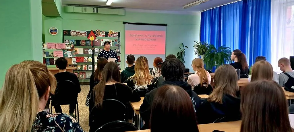 Посредством презентации молодые люди узнали о жизни и творчестве Б. Васильева и В. Астафьева, были просмотрены отрывки из фильмов «А зори здесь тихие» и «Офицеры», а также видеоролики «Жизнь Виктора Астафьева» и «Юлия Друнина. Война глазами поэта».