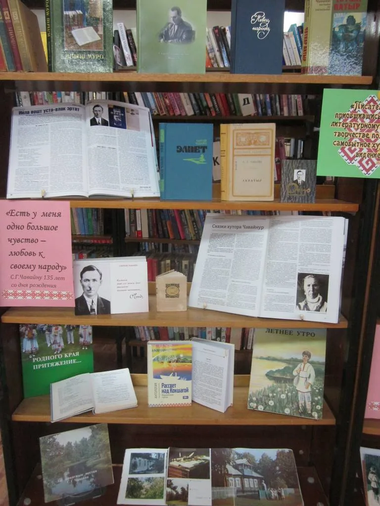 На выставке представлены книги и журналы о жизни и творчестве С. Чавайна. Сборник научных трудов: «Сергей Чавайн: Личность. Творчество. Эпоха»; «Певец народа»; Воспоминания и документальные очерки о писателе. Литературный критик Г. Зайниев в книге о марийской литературе «Илыш муро» («Песня жизни») первую главу посвятил С. Чавайну. В журнале «Марий сандалык», 2017г. №1-2 В. Четкарев в статье «Сказки хутора Чавайнур» знакомит с мамой писателя Татьяной Анисимовной, которая знала много марийских сказок и передала эти знания сыну.