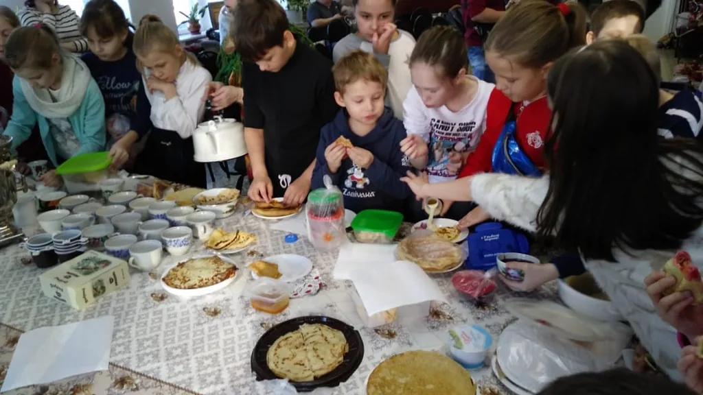 Продолжилось мероприятие угощением – чаепитием и блинами. Долго засидеться ребятам за столом Баба-Яга не дала, вспомнив, что у нее есть волшебная метла, предложила детям поиграть в игру «Метание метелок», «Наряди Масленицу» и «Тир Бабы-Яги».