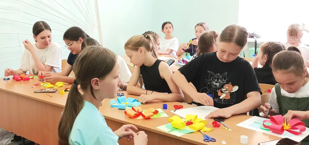 Десятого июня для воспитанников клуба «Искорка» из Центра дополнительного образования был организован патриотический час «Моя Россия», включавший в себя мастер-класс по созданию объёмной поделки «Цветок» из бумаги.