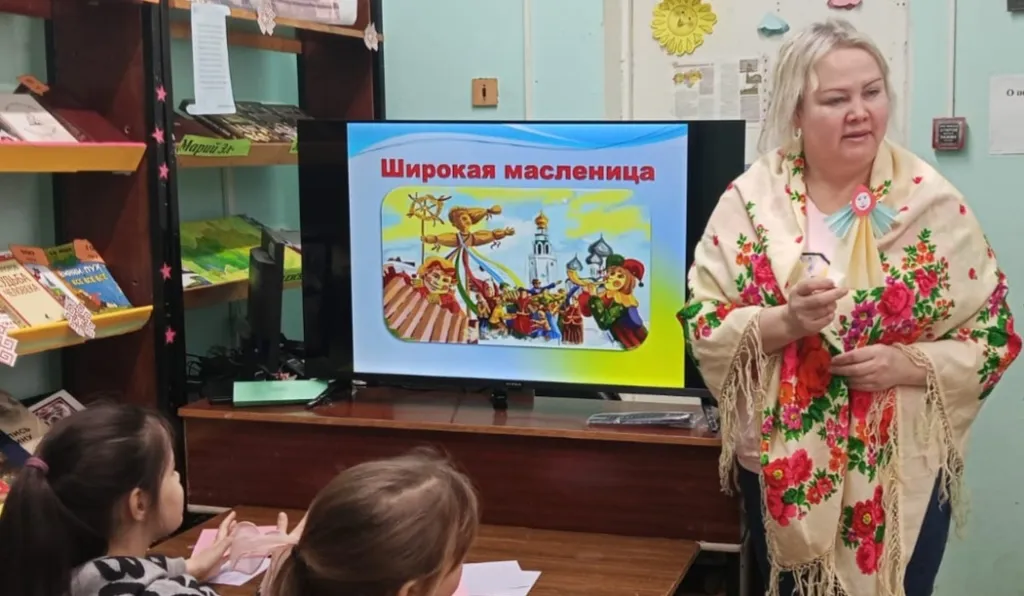 Мероприятие сопровождалось электронной презентацией. Библиотекарь рассказала об истории праздника. Вместе с присутствующими вспомнили традиции и обычаи Масленицы.