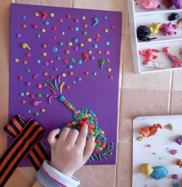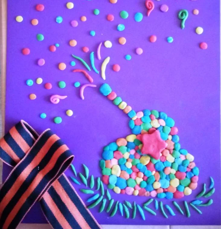 Открытку можно делать с малышами 4-5 лет и старше. Для открытки пригодится картон А4 фиолетового или синего цвета, пластилин, георгиевская ленточка. На картоне нужно нарисовать силуэт танка простым карандашом, чтобы ребенок знал, где выкладывать пластилин, то есть определить границы. Работа над танком похожа на выкладывание мозаики. Из небольших кусочков делаются кружочки разного цвета, а затем лепешечки овальной формы. Затем можно приступить к выполнению салюта, техника та же, только лепешки для салюта круглые. Пушечные залпы – раскатанные тоненькие колбаски, некоторые колбаски можно свернуть «улиточкой». На танк нужно вылепить красную звезду. Снизу в виде тоненьких листочков вылепить и выложить травку(она играет роль лавровой ветки).
