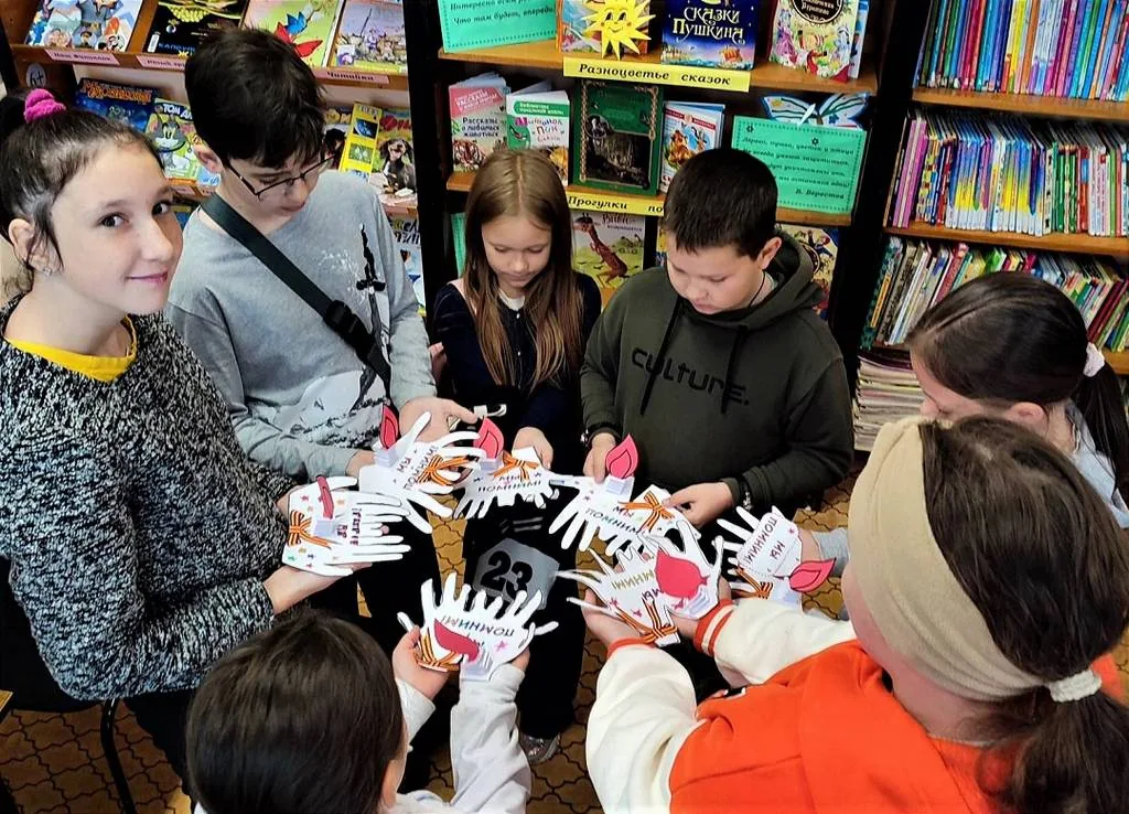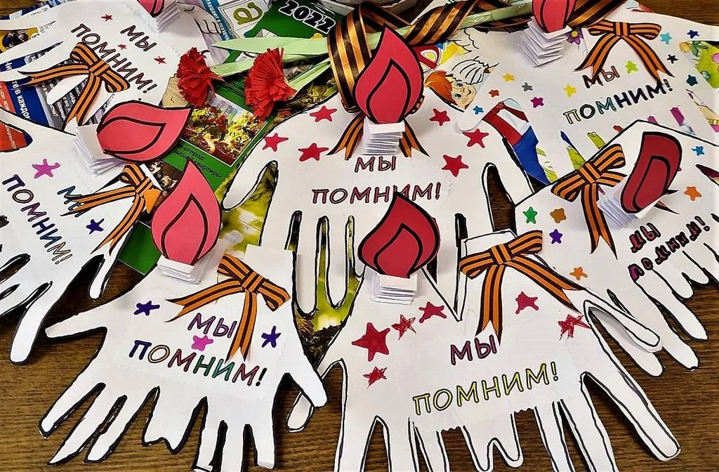 Сотрудник библиотеки предложила ребятам сделать свечу Памяти своими руками. Ребята активно принялись за дело, обводили свои ладошки, вырезали огонёк, георгиевскую ленточку, делали из бумаги свечу, а после собирали композицию на ладошке.