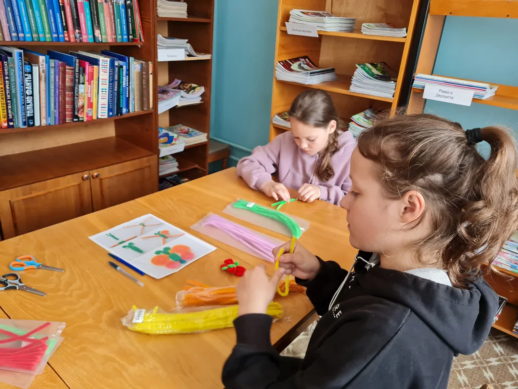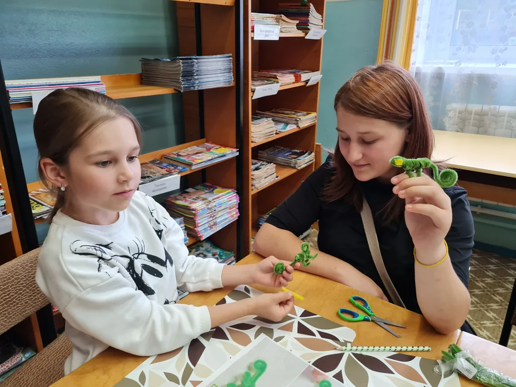В библиотеке-филиале № 8 был проведен мастер-класс «Весёлые зверята». На занятии детям из летнего лагеря «Любознайка» и читателям библиотеки было предложено сделать поделки из синельной проволоки - бабочка, хамелеон и зайчик.