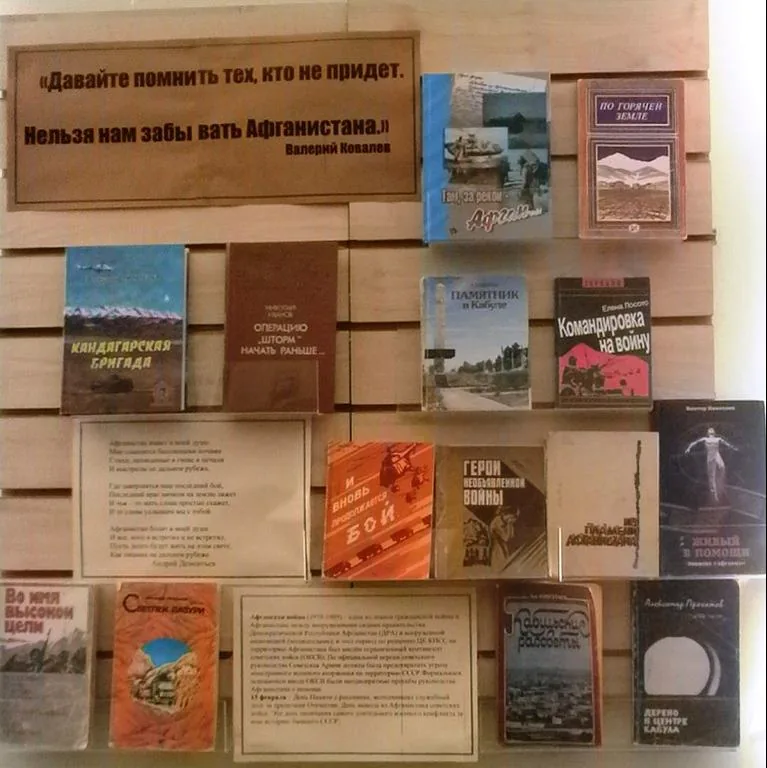 Выставка - стенд "Давайте помнить тех, кто не придет. Нельзя нам забывать Афганистана" (В. Ковалев), оформленная в библиотеке, была приурочена ко Дню памяти о россиянах, исполнявших служебный долг за пределами Отечества.