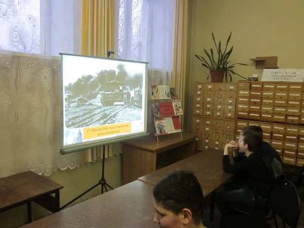 В течение урока звучали стихи Юрия Воронова («Опять война…», «Время-лекарь…») и О. Берггольц («Я говорю с тобой под свист снарядов…») и др. Завершилось мероприятие обзором книг с выставки-памяти «Война. Блокада. Ленинград».