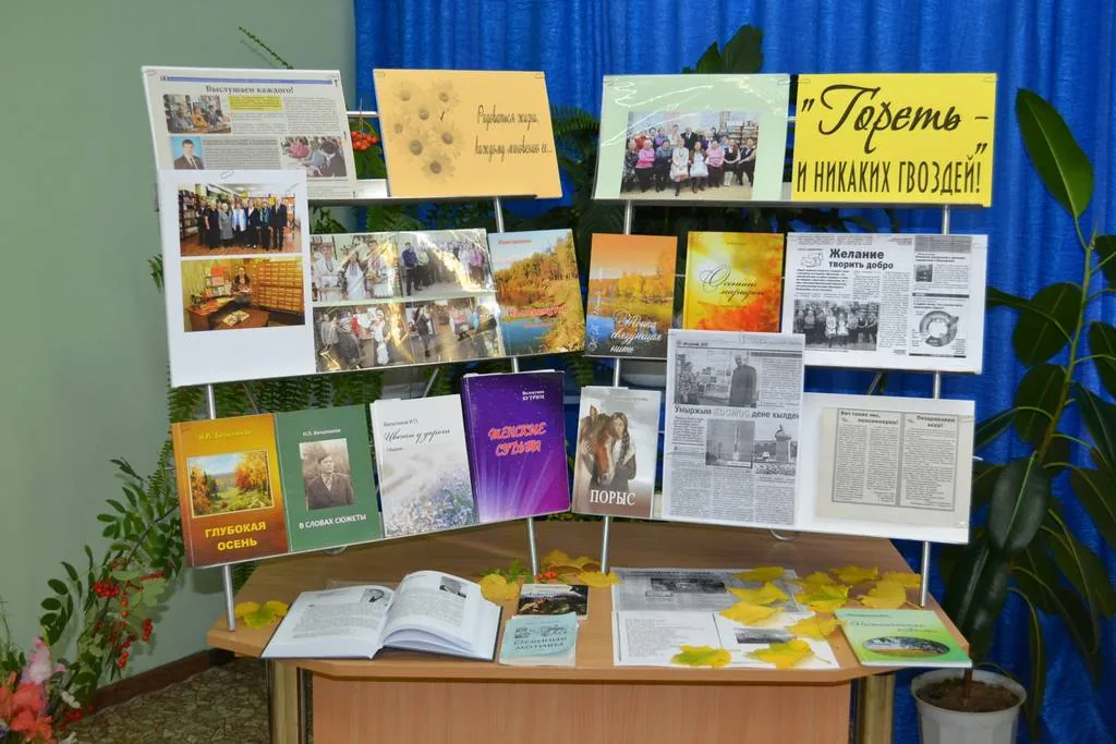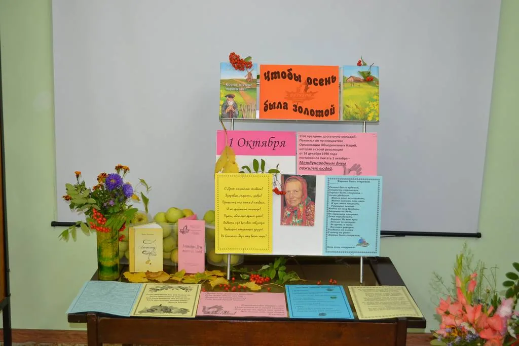 К мероприятию оформлена развернутая книжная выставка «Чтобы осень была золотой…», на которой представлена литература о МДПЛ, вторая половина выставки «Радоваться жизни, каждому мгновению ее…», знакомит с фрагментами деятельности клуба «До и после 55» за 8 лет, где наряду с фотографиями и газетными статьями: «Желание творить добро», «Вот такие мы, пенсионерки!» достойное место нашли книги уважаемых и почитаемых членов клуба: «Горький вкус полыни», «Женские судьбы» и «Порыс» В.Бутрим; «Осенние мотивы» и «Неоконченная повесть» Ф. Москвичевой (с 1933 г.р.); «Глубокая осень», «В словах сюжеты» И. Бельтюкова; «Осенний марафон», «На перепутье», «Тонкая связующая нить» Ю. Цветковой, которая дважды была у нас в гостях, а мы у нее – на презентации ее книги «Я люблю тебя, Русь!». Новый биобиблиографический справочник был раскрыт на 322 с., на которой имеется материал об А. Скале, нашем читателе и члене клуба, который со сказкой «Лягушка- колодезница» вошел в собрание сочинений авторов XXI в. «Литературный фонд» от бренда «Фонд развития литературы им. А.М. Горького» (2018).