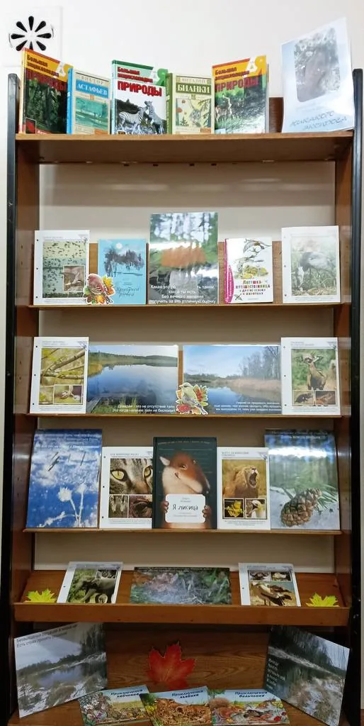 Выставка дополнена научно-популярной литературой "Большая энциклопедия природы", которая посвящена удивительному миру животных, растений, водоёмов и заповедников.