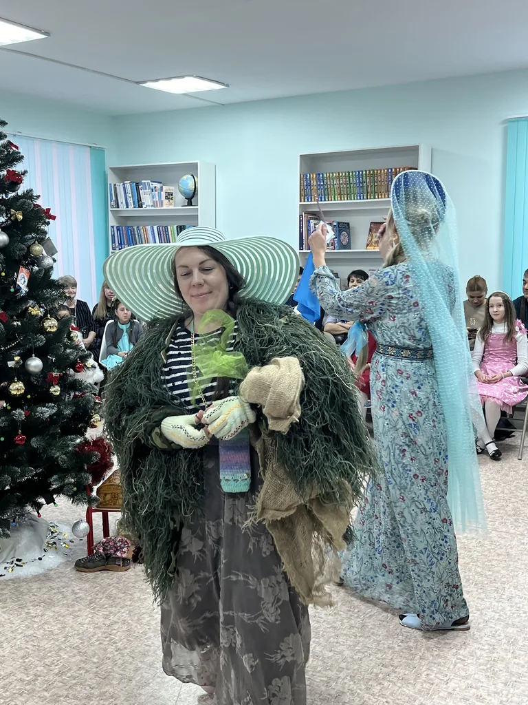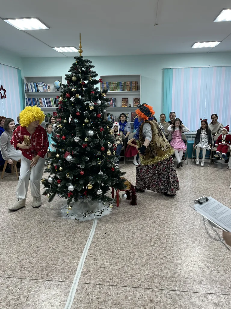 С помощью волшебной книги и помощи Василисы Премудрой участники мероприятия оказывались в разных сказках, где все вместе помогали Деду Морозу вернуть волшебную звезду с его посоха. Во время представления дети потанцевали с Водяным, помогли Кикиморе прибрать лес, переживали за домовенка Кузю, водили хороводы. История закончилась благополучно – звезда нашлась! Огоньки на ёлке засверкали! Подарки дети получили!