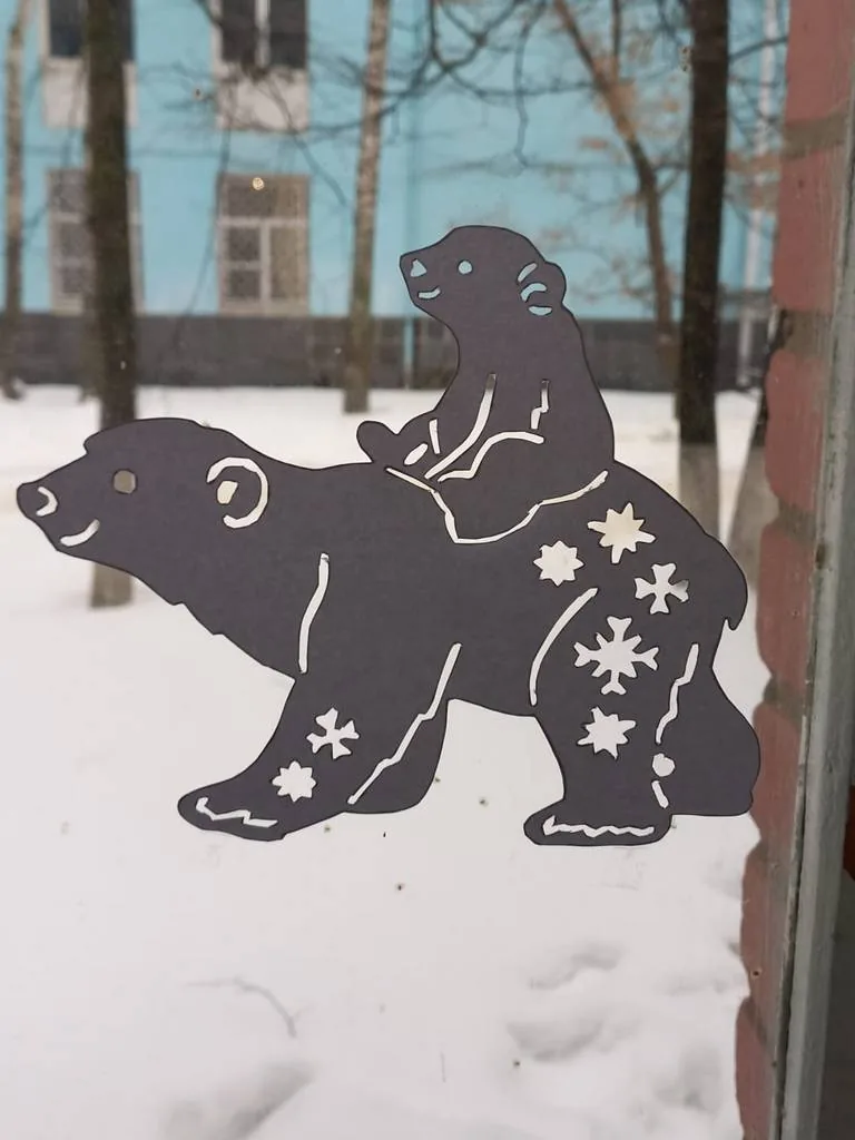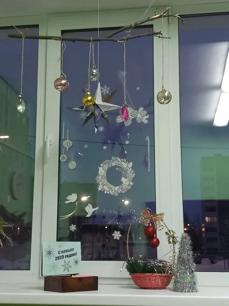 Библиотечные окна украшают праздничные инсталляции, детские рисунки, новогодние гирлянды.