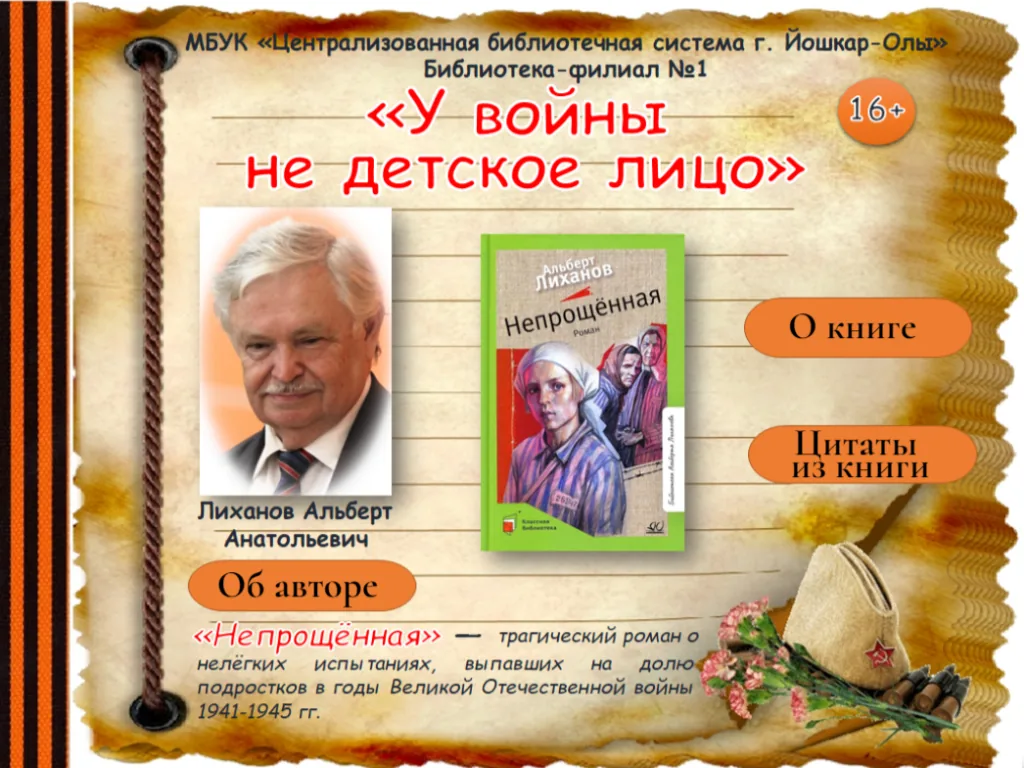 С помощью интерактивного плаката можно познакомиться с творчеством одного из классиков детской литературы – Альбертом Лихановым, с его романом «Непрощённая» (16+), который является одним из наиболее трагических и пронзительных произведений о военном детстве, повлиявшем на судьбы детей и подростков. «На войне было трудно всем: солдатам и генералам, мужчинам и женщинам. Но детям было всего трудней», - говорил Альберт Лиханов.