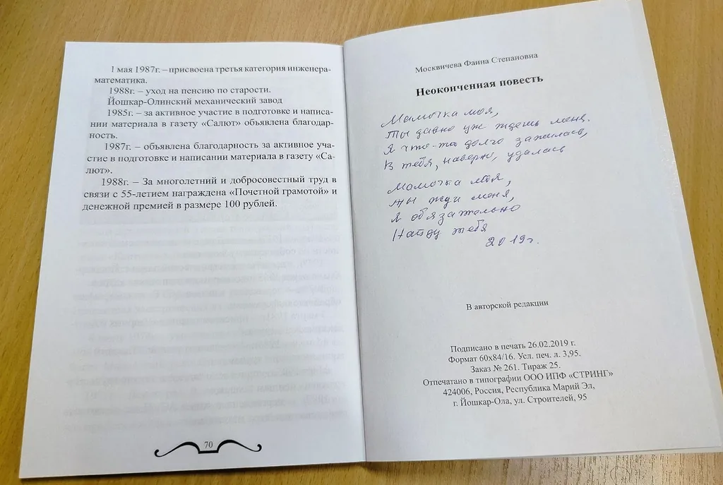 Свою последнюю книгу «Неоконченная повесть» (подзаглавие написано ею от руки – «о четвёртой части моей жизни») она подарила мне 28.03.2019 г.