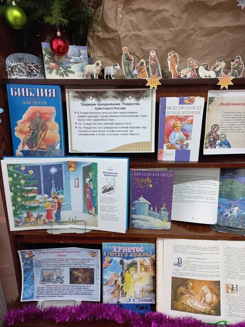 Выставка дополнена фактурными персонажами этого древнего библейского праздника – сотрудники библиотеки изготовили рождественский мини-вертеп, с фигурками животных и соответствующей атрибутикой.