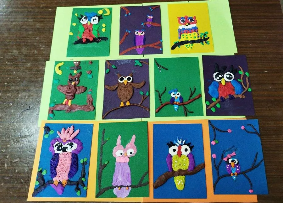 Далее дети приступили к созданию картины из пластилина, совы получились у всех разные и очень добрые.