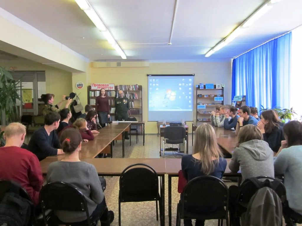 19 февраля в Центральной библиотеке для студентов ВК ПГТУ «Политехник» и членов библиотечного клуба «До и после 55» состоялся час откровенного разговора «Бессмертный подвиг защитников Отечества». Гостем мероприятия стал председатель Марийской ассоциации жертв политических репрессий, основатель и руководитель Мемориального народного музея истории ГУЛАГа в Йошкар-Оле Николай Александрович Аракчеев. Он озвучил цифры потерь в годы Второй мировой войны и жертв политических репрессий. Прозвучал рассказ о судьбе нашего земляка, военного фотокорреспондента В. Тёмина. Он – автор снимка последнего дня войны и фотокорреспондент на Нюрнбергском процессе.
