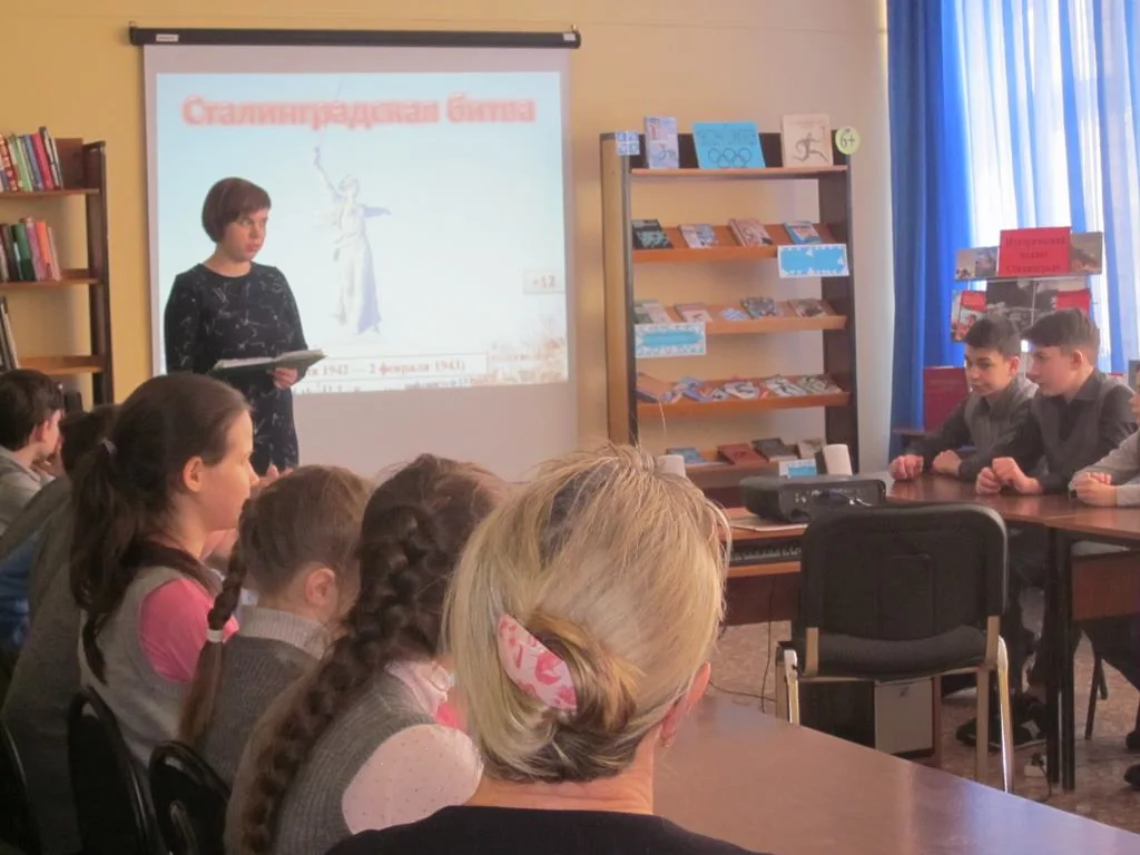 7 февраля в Центральной библиотеке с учащимися 6 «Б» класса МБОУ «СОШ № 23» была проведена литературно-музыкальная гостиная «Где отвели от Родины беду», посвященная трагическому событию – Дню разгрома советскими войсками немецко-фашистских войск в Сталинградской битве. Открылась гостиная с траурной мелодии и грозный голос Юрия Левитана объявил о полной капитуляции немцев под Сталинградом 2 февраля 1943 года. Библиотекарь Павлова Е. В. познакомили с хроникой военных событий, с конкретными фактами, рассказала о героях Сталинградской битвы – Паникаха М., военный моряк, бросившийся под танк, Павлов Я., державший, вместе с товарищами, оборону дома 58 дней, Зайцев В., снайпер, на счету которого около 300 убитых фашистов. Далее ребята очень душевно читали стихи о сталинградском сражение: Д. Бедного «Он пал, но честь его жива…», А. Суркова «Защитник Сталинграда», О. Берггольц «Сталинграду», Р. Рождественского «Мамаев Курган» и др. В течение всего мероприятия в гостиной звучали военные песни: «Сказ о Мамаевом кургане…», «Хотят ли русские войны?», «О Сталинграде», «Вот солдаты идут», «Поклонимся великим тем годам». Завершилось мероприятие минутой молчания.