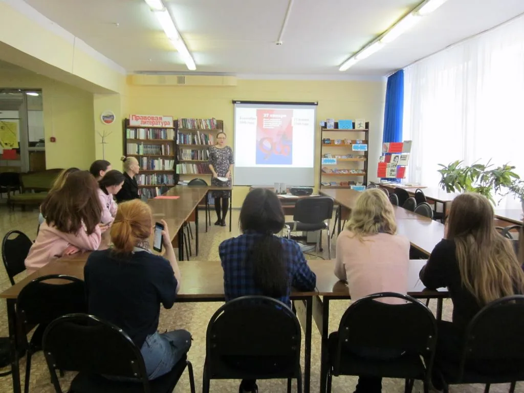 Библиотекарь Земницкая Н. О. познакомила молодых людей с подробностями жизни в осажденном городе: какими были нормы выдачи хлеба, как ленинградцы устраивали свой быт без водопровода и электричества. Как переносили голод, смерть близких, артиллерийские обстрелы и воздушные налеты. Студенты узнали, что выстоять морально в это тяжёлое время горожанам помогали стихи Ольги Берггольц и исполнение Седьмой симфонии Дмитрия Шостоковича, звучавших по радио; что в период блокады ленинградцы ощущали поддержку всей страны. Особенно, когда начала функционировать «дорога жизни». Вопреки голоду, смерти, страху город выстоял, блокада была снята.