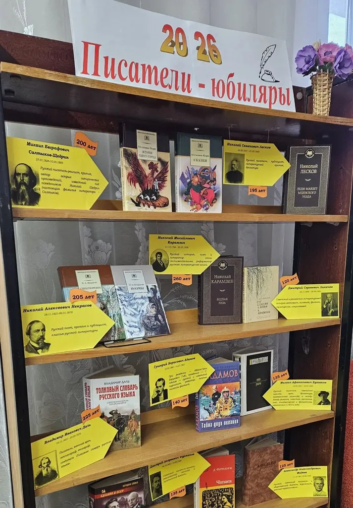 В библиотеке-филиале № 28 оформлена выставка-просмотр «Писатели-юбиляры 2026». Наша страна богата талантами, особенно литературными. Многие из них известны не только в России, но и за ее пределами. Писатели, чьи имена навсегда вписаны в нашу историю, подарившие нам интереснейшие произведения. Каждый из представленных на выставке писателей в 2026 году это юбиляр, чья-то дата уже измеряется цифрой в 200 лет, а кому-то только 85. Но, несомненно, все они выдающиеся писатели. Их проза или поэзия, заставляющие нас задуматься о любви, о взаимоотношениях между людьми, о мужестве, о долге знакомы нам со школьной скамьи. Вот, например, Владимир Даль и его знаменитая книга «Толковый словарь русского языка» помогает нам находить и объяснять подрастающему поколению значение того или иного слова, прославлять великий русский язык. Кроме того, на выставке представлены такие писатели как М.Е. Салтыков-Щедрин (200 лет), Н.А. Некрасов (205 лет), Н.С. Лесков (195 лет), В.И. Даль (225 лет), М.А. Булгаков (135 лет), Д.С. Лихачев (120 лет), Ю.С. Семенов (95 лет), Н.М. Рубцов (90лет) и другие. Приглашаем и вас посетить нашу выставку. И обязательно возьмите книгу писателя-юбиляра.