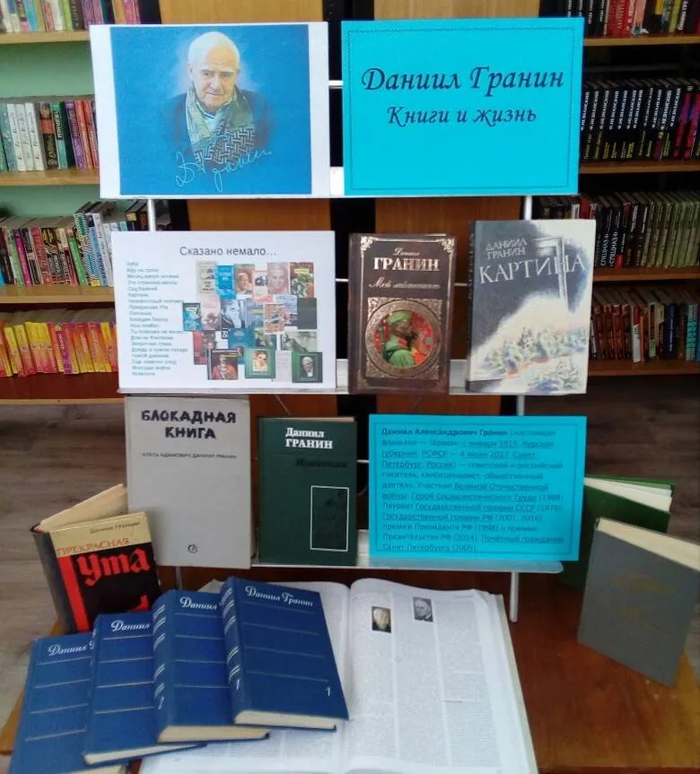 Даниил Гранин – писатель, прошедший войну, дошедший до Берлина в качестве командира роты танков. Многие герои Гранина – ученые, которые заняты не только наукой, но вынуждены решать и нравственные проблемы. Библиотекари рассказали старшеклассникам о жизни и произведениях известного писателя и общественного деятеля, акцентируя внимание на книгах, посвященных Великой Отечественной войне – повести «Клавдия Вилор», романе «Мой лейтенант», документальной хронике «Блокадная книга» (в соавторстве с Алесем Адамовичем).