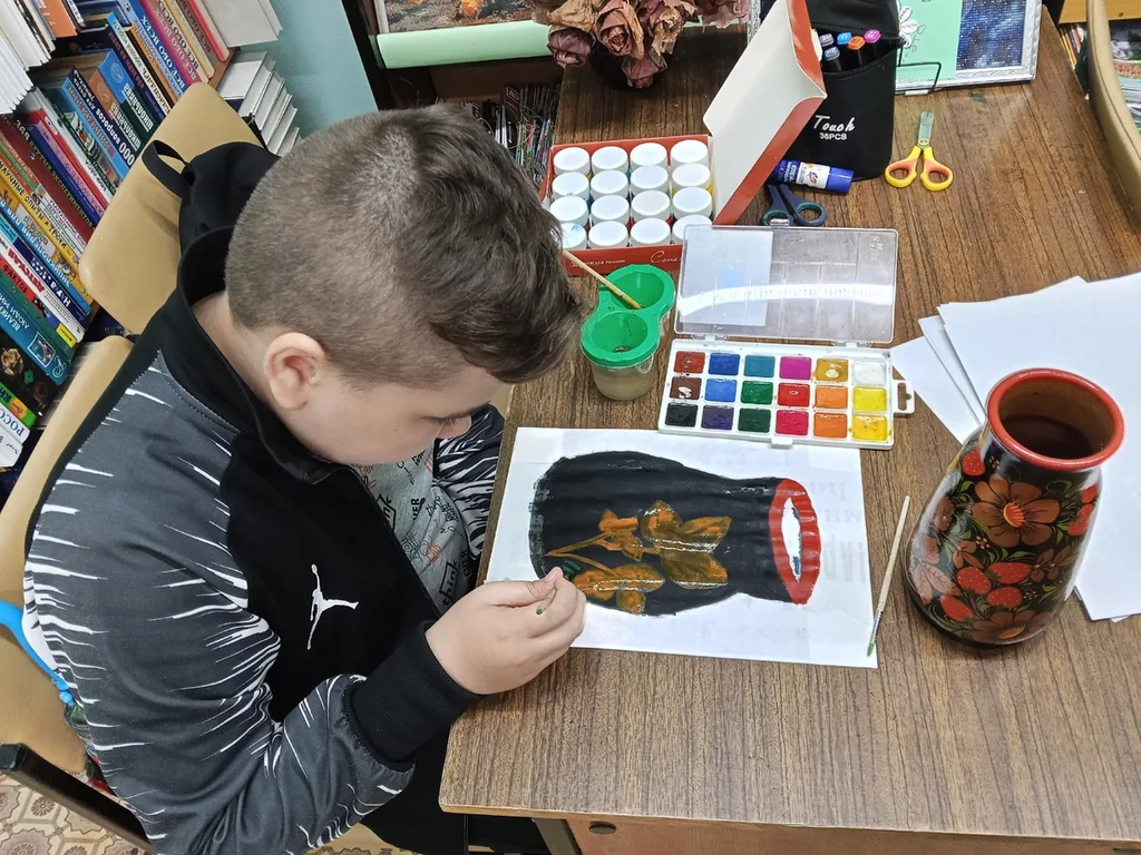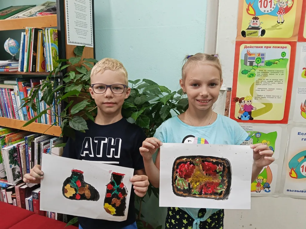 В конце мероприятия провели мастер-класс «Хохломская роспись». Рисунки с хохломской росписью наших юных художников можно увидеть на выставке в читальном зале нашей библиотеки.