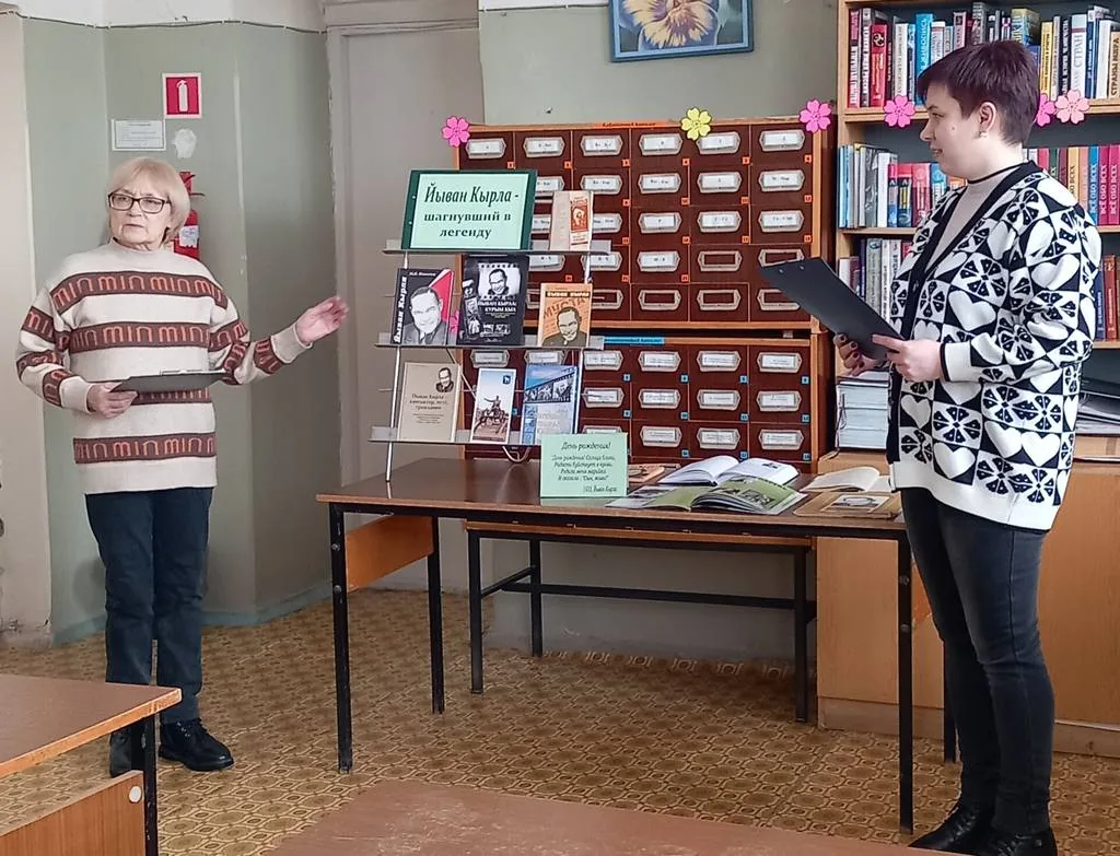 18 марта в библиотеке был проведён познавательный час «Шагнувший в легенду» к 115-летию со дня рождения Й. Кырла. Известный актёр Йыван Кырла или Кирилл Иванович Иванов стал знаменит, исполнив роль Мустафы в первом советском звуковом фильме «Путёвка в жизнь». Также он был поэтом, которого волновали остросоциальные вопросы. Сотрудники библиотеки бережно относятся к сохранению памяти о нём. Ведь наша библиотека находится на улице, гордо носящей имя этого талантливого актёра и поэта. Именно поэтому, принимая участие в акции, организованной нашими коллегами из библиотеки-филиала №8, мы прочитали на русском и марийском языках стихотворение марийского поэта Миклая Казакова «Улица имени Й. Кырли». Оно же звучало и на нашем мероприятии, вместе со стихами самого Й. Кырли. Энергия и вера в лучшее передаётся в этих строках последующим поколениям. Вместе с бережно хранимой памятью о ярком представителе марийского народа – Йыване Кырла.