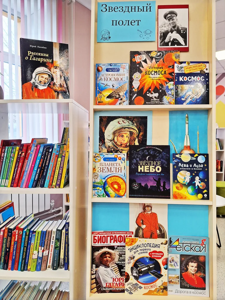 Ко Дню космонавтики в библиотеке оформлена одноименная выставка- демонстрация, на полках которой представлены энциклопедии: «История космоса», «Астрономия и космос», «Звездное небо», «Планета Земля», а также журналы с биографией, документальными фото и интересными фактами из жизни первого космонавта.