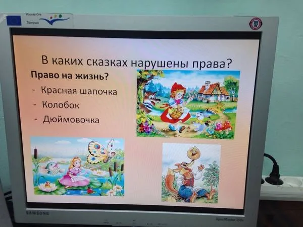 Дети отвечали на вопросы, разбирали жизненные ситуации и высказывали свое мнение. Для ребят ведущие подготовили презентацию, где на примерах сказочных героев дети выясняли, какое право было нарушено.