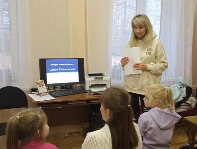 В начале встречи библиотекари познакомили ребят с историей жизни необычного мальчика Варфоломея, который впоследствии становится великим святым, довольно-таки известным в православном мире. Ребята узнали, что будучи отшельником, Сергий Радонежский делил последний кусок хлеба с дикими животными, проживающими рядом. Сотрудники филиала рассказали, как на месте скромной кельи старца впоследствии выросла знаменитая Троице-Сергиева Лавра. Затем, библиотекари рассказали какую немаловажную роль сыграл святой Сергий в Куликовской битве, благословив московского князя Дмитрия Донского и его дружину перед великой битвой с врагом Руси – татаро-монгольским игом.