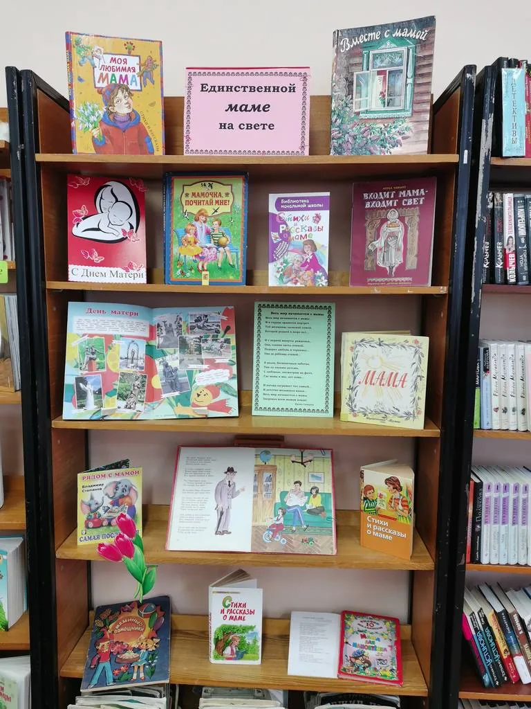 К праздничной дате была подготовлена выставка книг «Единственной маме на свете». На ней представлены книги авторов, которые с трепетом воспевают роль матери в мире: А. Барто, И. Ереминой, А. Чокану, Л. Рачевой, рассказ «Мама для мамонтенка» Д. Непомнящей и других детских писателей. Юные читатели с удовольствием прочитали стихотворения о маме из представленных книг и, таким образом, поздравили своих любимых мам с этим замечательным праздником женственности, заботы и любви!