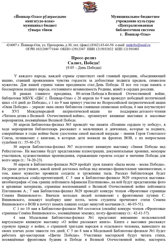 В Центральной детской библиотеке прошел историко-патриотический вечер «Ты в памяти и в сердце, Сталинград!», посвященный героизму защитников Сталинграда. Школьники узнали о подвигах защитников домов Павлова и Заболотного, а также о судьбе Зинаиды Петровны, родившейся в подвале Дома Павлова. Встреча подчеркнула роль марийских воинов в победе и показала документальные кадры с участием Зинаиды Петровны.