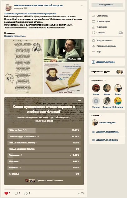 Этой весной проводилось немало поэтических сетевых акций, и библиотека-филиал № 3 присоединилась к некоторым из них, например, поучаствовала в акции «Поэтический май», представив стихотворения Мусы Джалиля «Май» и Игоря Северянина «Весенний день» и в акции «Любимые строки поэта», которая посвящена Пушкинскому дню в России со стихотворением «Признание». Также мы предложили нашим читателям пройти онлайн–опрос «Какое пушкинское стихотворение о любви вам ближе?». Приглашаем всех посетить наше сообщество в ВКонтакте.
