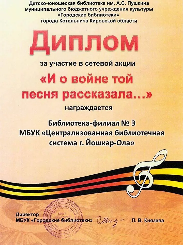 Также библиотека приняла участие в сетевой акции «И о войне той песня рассказала…». В библиотечном сообществе в ВКонтакте читатели имели возможность познакомиться с историей создания знаменитой «Застольной корреспондентской» К. Симонова, легендарной «Рио Риты», «Баллады о красках» Р. Рождественского, задорных песен «Два Максима», «Партизанская борода» и «Дорога на Берлин!», а главное вспомнить и послушать хорошие песни.