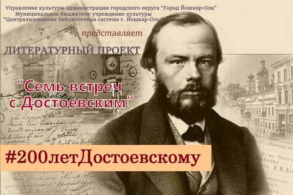 Городские библиотеки Йошкар-Олы приступили к реализации литературного проекта «Семь встреч с Достоевским». Имя великого классика русской литературы Ф. М. Достоевского (1821-1881) знакомо каждому русскому человеку. 200-летие со дня рождения писателя станет знаковым событием в культурной жизни страны и нашего города. Соответствующий Указ «О праздновании 200-летия со дня рождения Ф. М. Достоевского» подписан Президентом Российской Федерации В. В. Путиным в 2016 году.