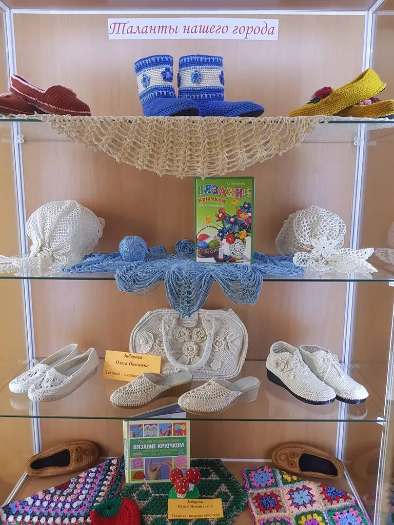 Ежегодно в преддверии Дня города мы знакомим читателей с талантливыми людьми нашего города. В этот раз своим умением делится активная читательница Центральной библиотеки имени Р. С. Иванченко Зибарова Ольга Павловна. На выставке представлены ее вещи, связанные крючком: головные уборы – банданы; тапочки разных цветов и конфигураций; дамская сумочка, которую непременно хочется примерить на себя. Невероятно, но от простых изделий можно усовершенствовать своё мастерство до таких «вязаных шедевров». Выставку дополняют книги по вязанию крючком из фонда библиотеки.