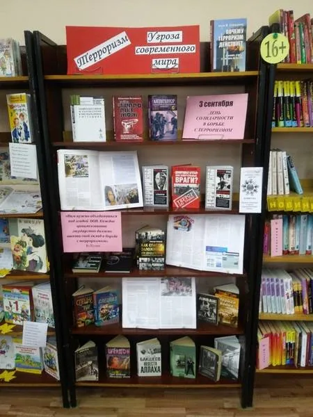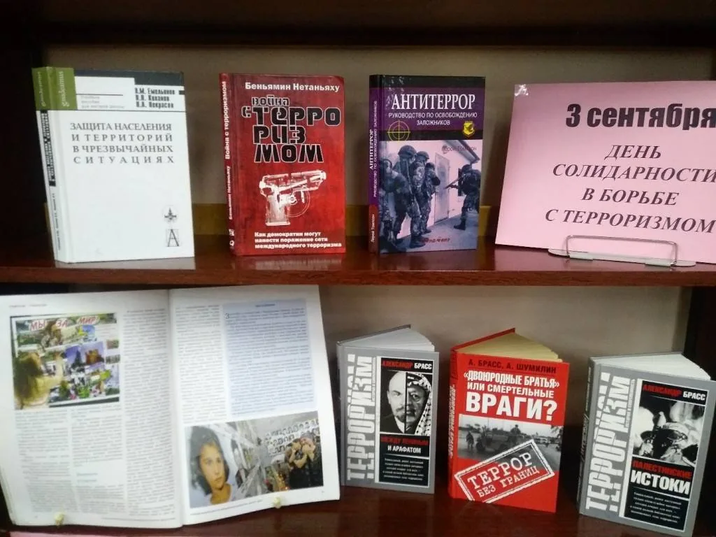 В Центральной библиотеке к этой дате оформлена выставка-досье «Терроризм – угроза современного мира», где представлены книги, посвященные борьбе с терроризмом: А. Дершовиц «Почему терроризм действует», Л. Томпсон «Антитеррор: Руководство по освобождению заложников», А. Черницкий «Как спасти заложника или 25 знаменитых освобождений». Серия «Терроризм: история и современность» представлена на выставке книгами А. Брасса «Между Лениным и Арафатом», «Палестинские истоки». О том, как связаны между собой террористы и наркоторговля, рассказывает книга Ю. Иванича «Наркотики и терроризм».