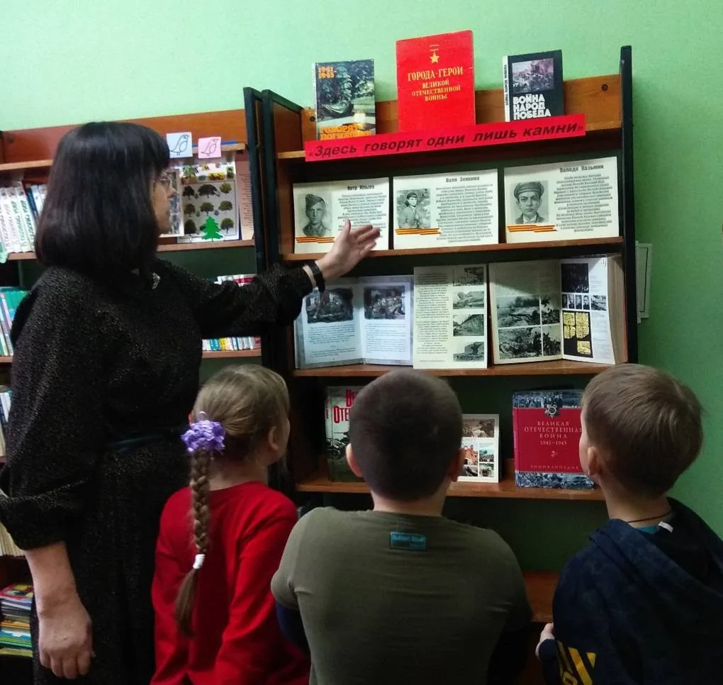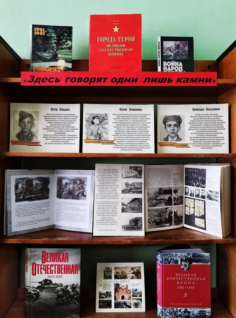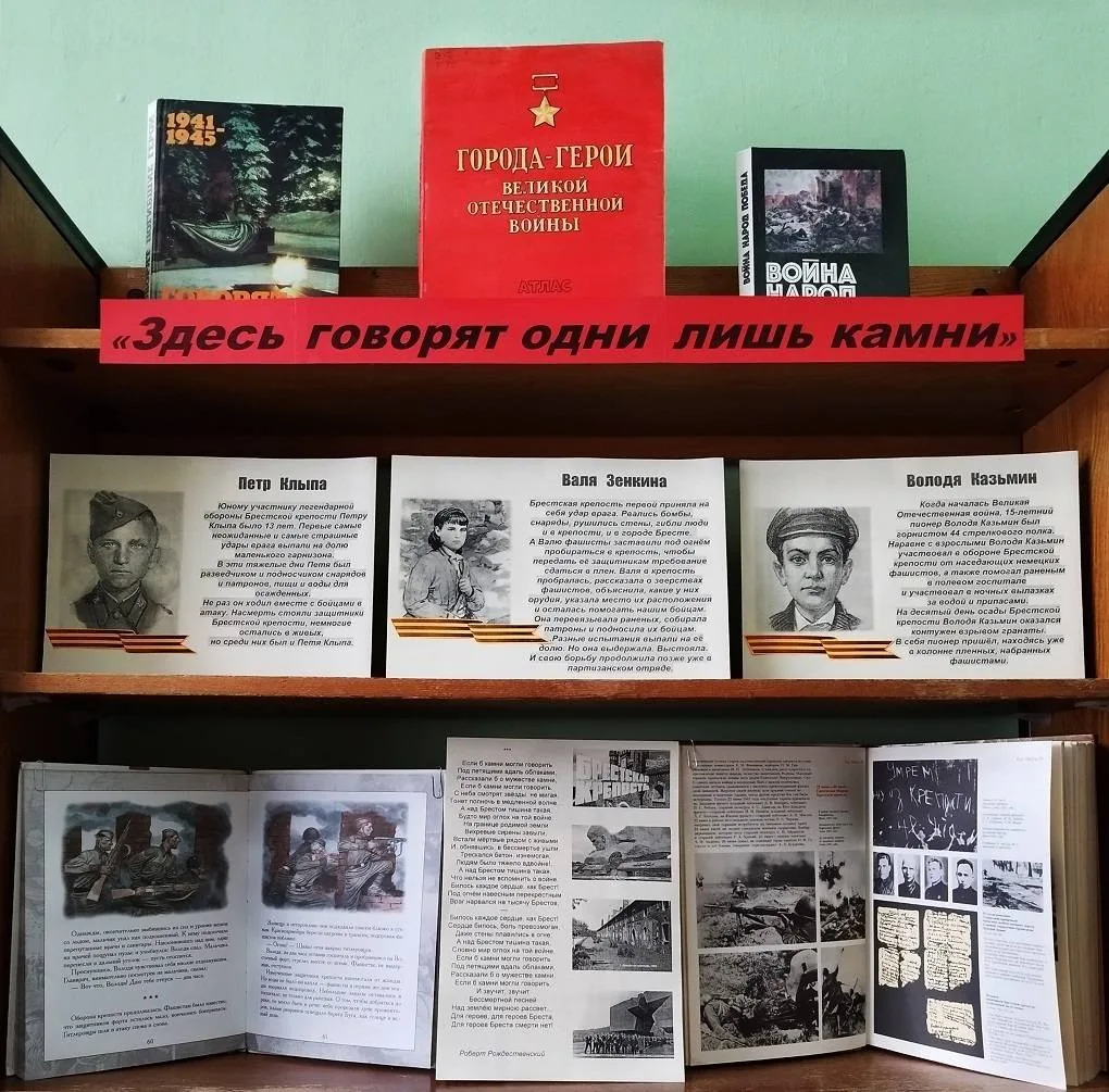 У выставки на данную тему библиотекарь рассказала детям об обороне Брестской крепости. Защитники крепости – солдаты и офицеры более чем 30 национальностей, атакованные фашистскими войсками на рассвете 22 июня 1941 года, держали оборону почти месяц, оставаясь в глубоком тылу немецких войск, наступавших на Москву. В жесточайших, тяжелейших условиях сопротивления сражались наши бойцы, среди которых были и юные ребята: Володя Казьмин, Валя Зенкина, Петр Клыпа.
