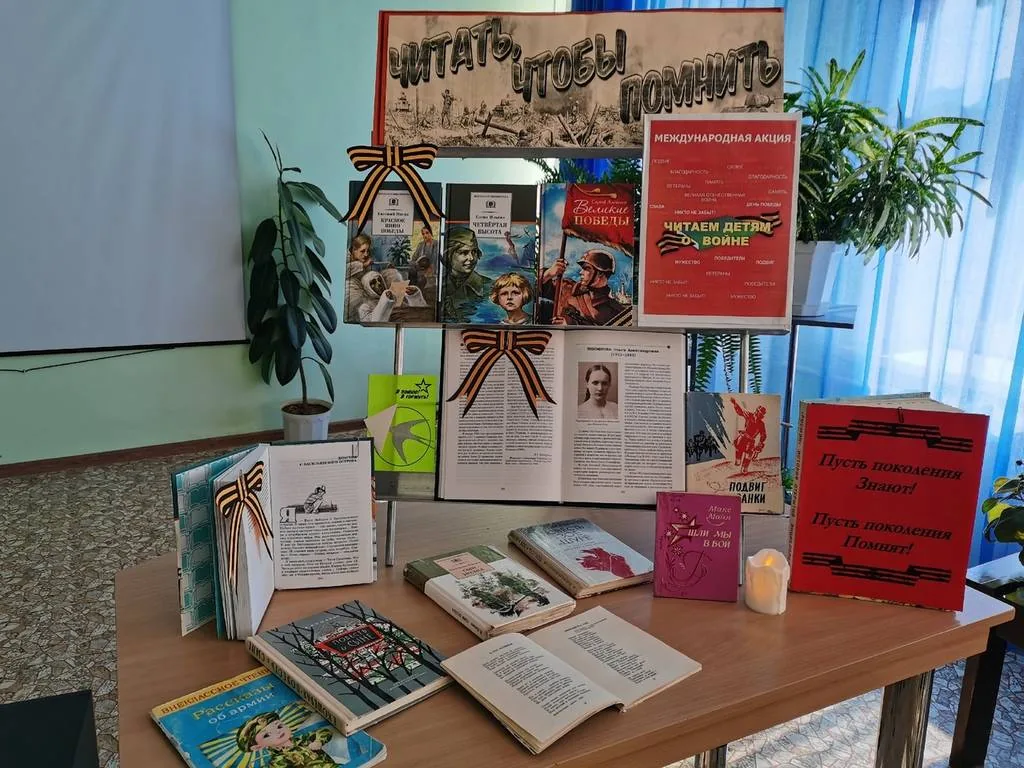 К мероприятию была подготовлена выставка «Читать, чтобы помнить», на которой были представлены книги: С. Алексеев «Великие Победы»; Е. Носов «Красное вино Победы»; В. Катаев «Сын полка»; Л. Космодемьянская «Повесть о Зое и Шуре»; Е. Кошевая «Повесть о сыне» и другие.