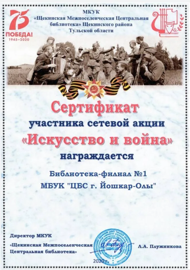 - сетевая акция «Искусство и война», организатор: МКУК «Щекинская межпоселенческая ЦБ» г. Щекино, Тульская область, получен сертификат;