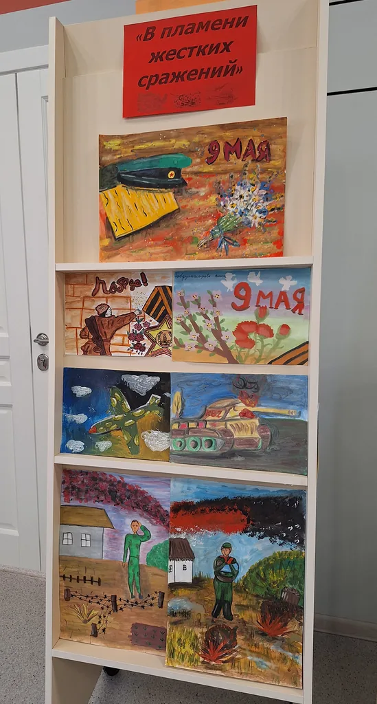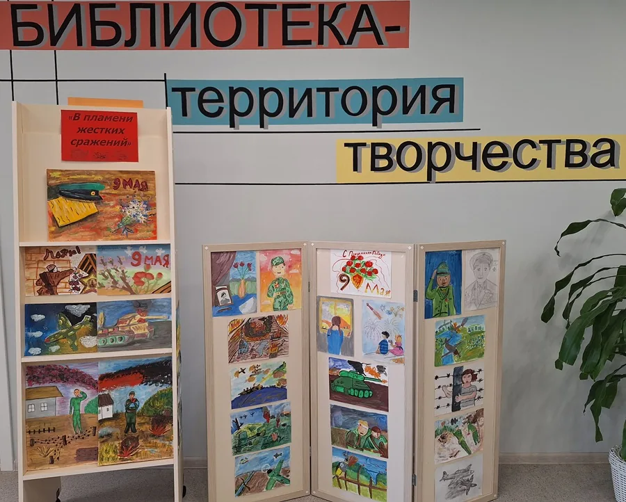 В библиотеке-филиале №1 к 80- летию Великой Победы оформлена выставка детских рисунков «В пламени жестких сражений» объединения «Творческое вдохновение». Работы предоставлены детским клубом «Искорка».