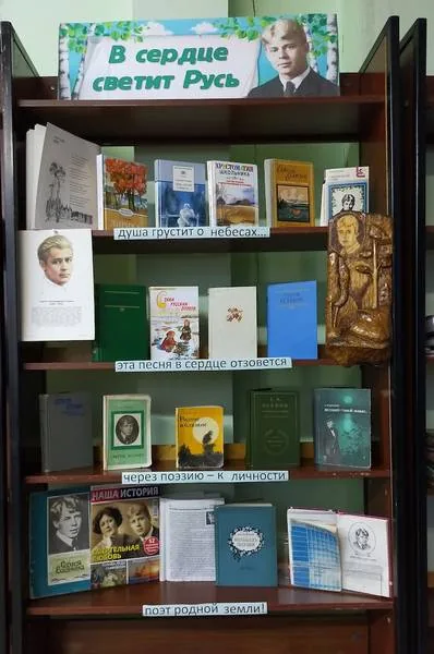 В 2020 году исполнилось 125 лет со дня рождения Сергея Есенина, известного русского поэта, лирика, яркого представителя крестьянской поэзии. Этой юбилейной дате посвящена книжная выставка, подготовленная в библиотеке-филиале №12 «В сердце светит Русь". На выставке представлены произведения великого поэта, а также литературоведческие издания о биографии Сергея Есенина. Центральное место занимает сборник стихов и поэм «Душа грустит о небесах…», в который вошли его широко известные стихотворения: «Разбуди меня завтра рано…», «Я последний поэт деревни…», «Исповедь хулигана», «Не жалею, не зову, не плачу…» и многие другие.