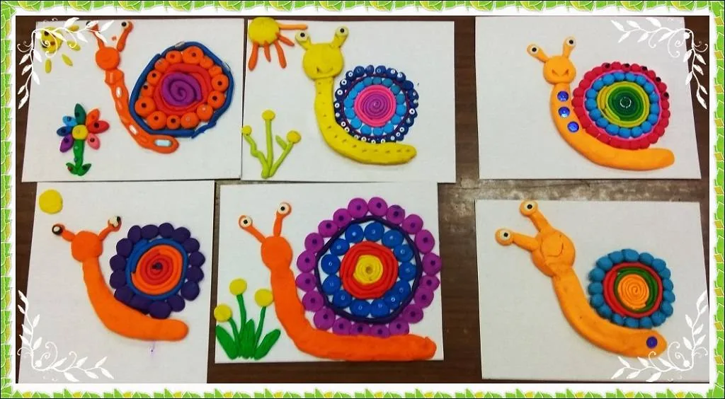 Затем дети приступили к лепке аппликации из пластилина на заданную тему. Все ребята постарались, улитки получились разноцветными и веселыми, дети дополнительно украсили их бисером.