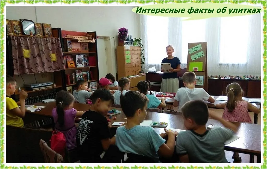 Библиотекарь прочитала стихотворение Грошева А. «Улитка», ребята отгадывали загадки, узнали интересные факты об улитках, оказывается эти маленькие создания обладают неимоверной силой, они могут нести груз в десять раз превышающий их собственный вес, медлительные, но далеко не глупые создания, они способны мыслить и принимать решения, основанные на своем жизненном опыте, раковины почти всех улиток закручиваются по часовой стрелке.