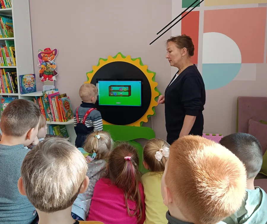Сначала дети поиграли в игру «Как вы шли в библиотеку», затем ребята прошли тест «Мое настроение» (на лепестки цветка, обозначающие радость, грусть, веселье, тревогу дошкольники прикрепляли «капельку- настроение»). На интерактивной панели Россия ребята прослушали отрывок из «Сказки о царе Салтане», увидели красочный портрет Александра Сергеевича и узнали вкратце о его биографии.