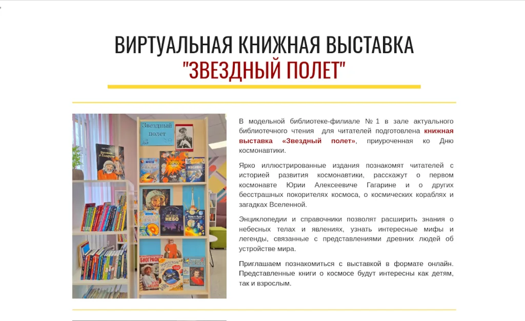 Модельная библиотека-филиал №1 представляет виртуальную книжную выставку «Звездный полет», приуроченную ко Дню космонавтики.